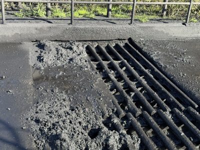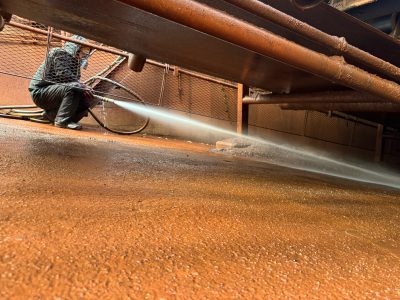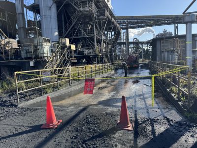 工場BC(ベルトコンベア)から落鉱により堆積したダストの洗浄作業風景です。